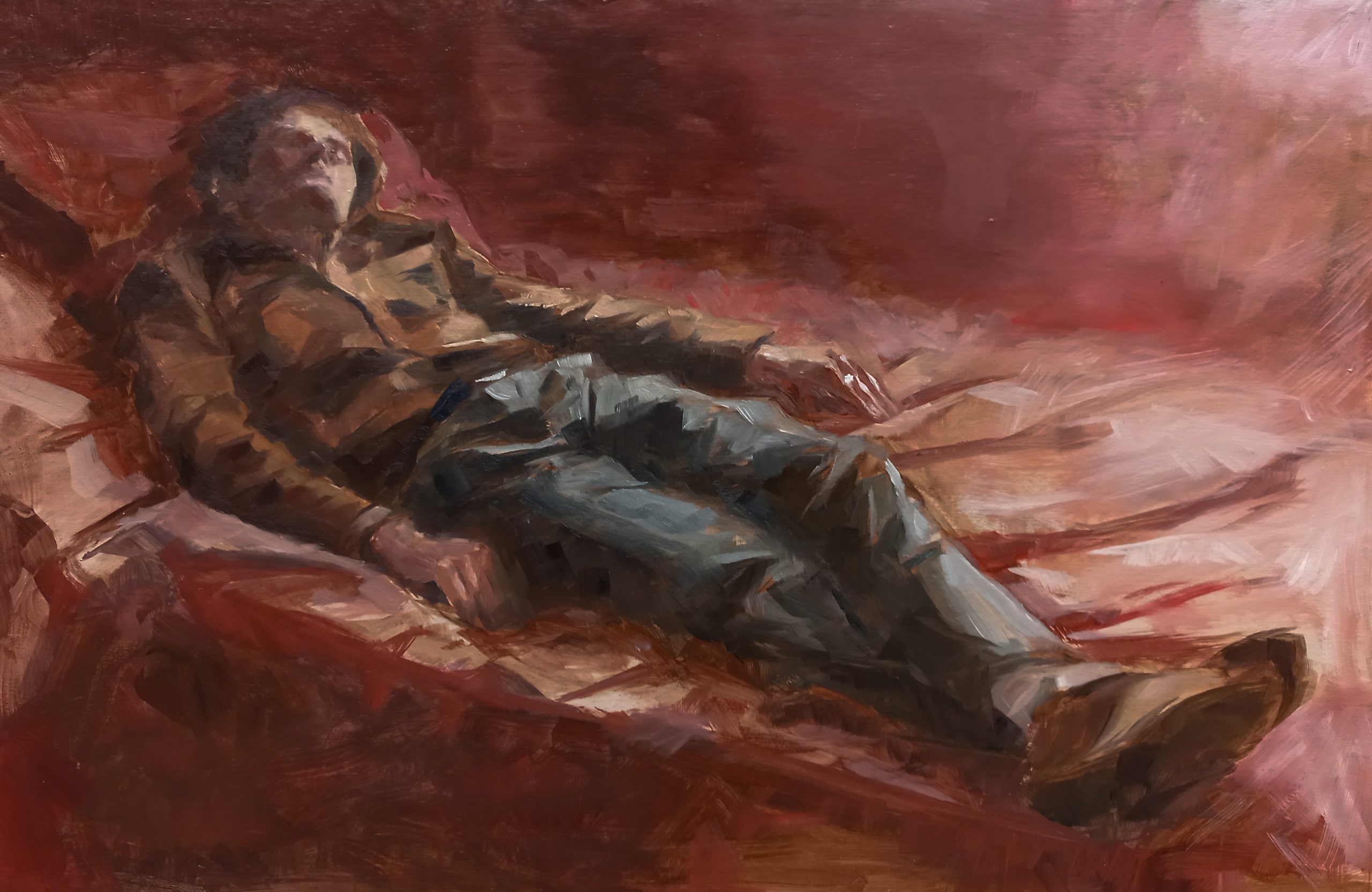 "Gisant n°1: Fever", oil on wood panel, 32x50cm. 2024. SOLD